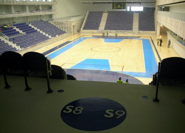 O piso do pavilhão é flutuante, tendo sido aplicado em três camadas de madeira de arce canadiana (igual ao do Palau Blaugrana, em Barcelona)