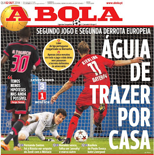 «O clube da Luz apresenta o segundo pior registo da presente edição da Champions. Neste momento há três equipas com zero pontos, o Ludogorets, o Benfica e o CSKA Moscovo. O saldo de golos desempata a situação: búlgaros (2-4, após enfrentarem Liverpool e Real Madrid); águias (1-5, Zenit e Leverkusen); e russos (1-6, Roma e Bayern).»