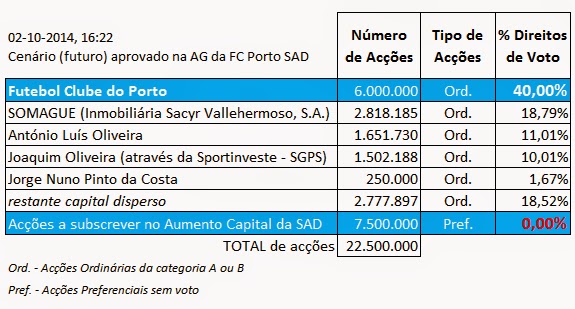 Se bem percebi a explicação do Dr. Fernando Gomes na Assembleia Geral, o facto do Clube ter ultrapassado os 50% dos direitos de voto e do capital social da FC Porto SAD, além de obrigar ao lançamento de uma OPA, irá fazer com que as novas 7500000 acções preferenciais sem voto, sejam convertidas em acções ordinárias. E, daí, resulta ao Futebol Clube do Porto passar a ser imputável acções representativas de cerca de 74% dos direitos de voto e do capital social da FC Porto SAD.